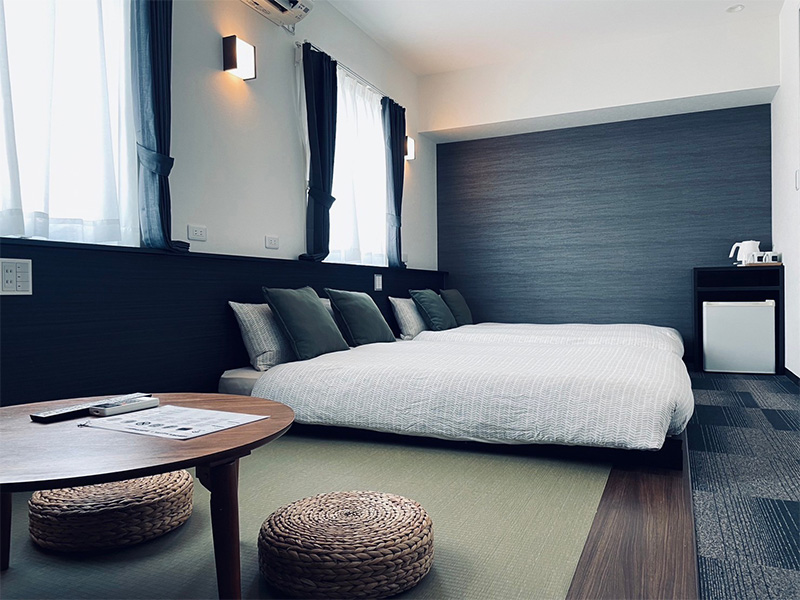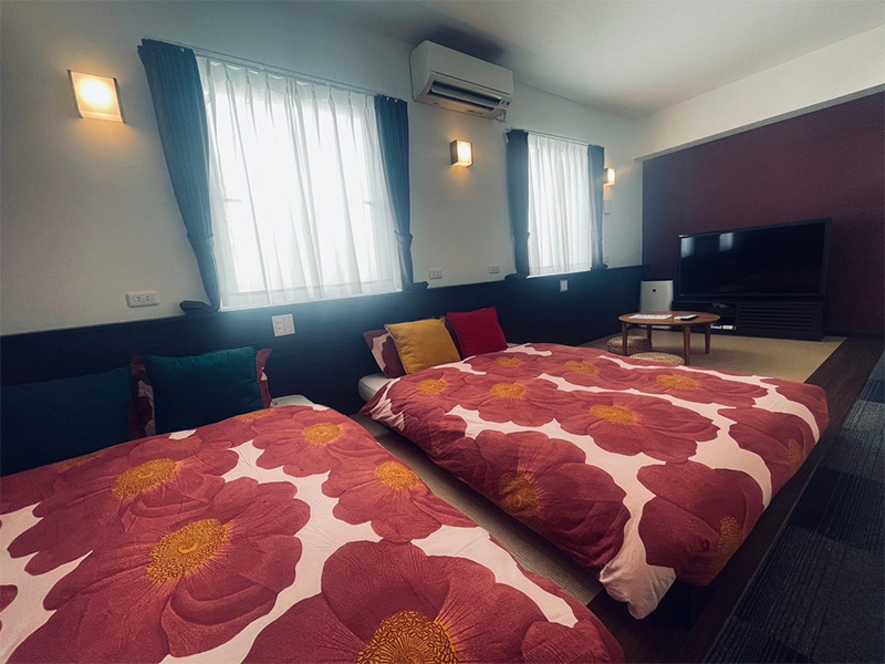 和風タイプのお部屋。お風呂とトイレはセパレートです。ベッドと和布団を用意しています。